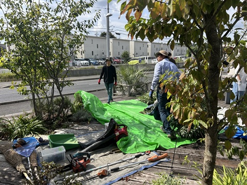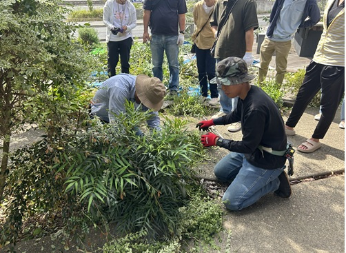 最初は座学で、木について学び、その後庭に出て剪定を実践。