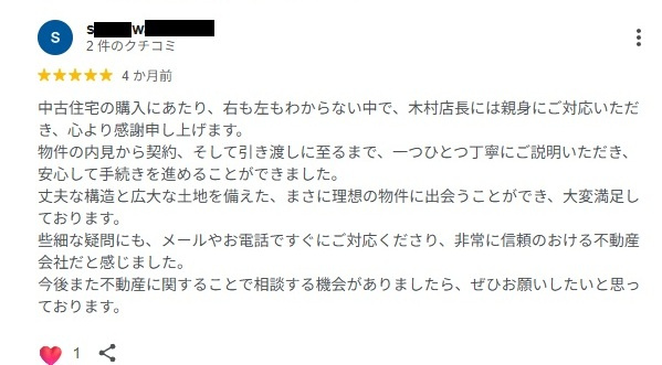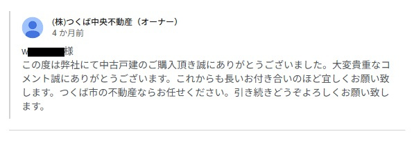 この度は弊社にて中古戸建のご購入頂き誠にありがとうございました。大変貴重なコメント誠にありがとうございます。これからも長いお付き合いのほど宜しくお願い致します。つくば市の不動産ならお任せください。引き続きどうぞよろしくお願い致します。