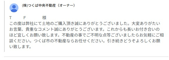 この度は弊社にて土地のご購入頂き誠にありがとうございました。大変ありがたいお言葉、貴重なコメント誠にありがとうございます。これからも長いお付き合いのほど宜しくお願い致します。不動産の事でご不明な点等ございましたらお気軽にご相談ください。つくば市の不動産ならお任せください。引き続きどうぞよろしくお願い致します。